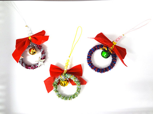 それぞれが思い思いの部材を選び、自分のセンスで配置して、鈴やベルを垂らしてみたり、モールを束ねてみたり、いろんなアイデアでリースを作ることができました。