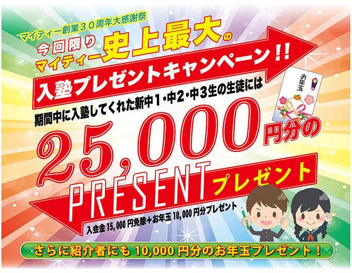 なんと、なんと!キャンペーン期間中に正式入塾してくれた新中1(現小6)・新中2(現中1)・新中3(現中2)生の方には、通常15,000円の入会金の免除と10,000円分のお年玉をプレゼント!入塾者には合計25,000円分のプレゼントとなります。さらに、入塾者を紹介してくれた人にも10,000円分のお年玉をプレゼントしちゃいます!まだマイティーに入っていない塾を検討中の方は、この機会をお見逃しなく!