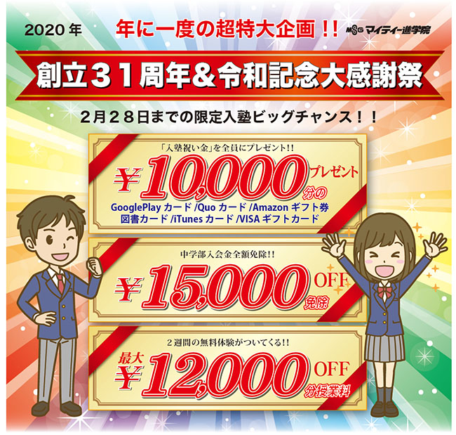 マイティー進学院創立31周年&令和記念の大入塾プレゼントキャンペーンが開催中です!今年は今だけのこのお得な機会に、ぜひご入塾を検討してください!