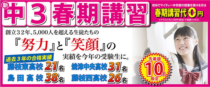 マイティーの春期講習では豊富な講習時間を使って、徹底的に1、2年生の内容を復習します。早期から基礎的内容を復習しますので、夏以降には本格的な受験問題に取り組むことが可能となります。当然、2学期の学調でも好成績が期待でき、特に受験前での成績の伸びが大きく違ってきます。ライバルよりも先にスタートして、志太榛原地区3000名の受験競争をマイティーで勝ち取ろう!