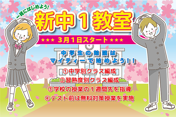 2024年度の新中学1年生(現在小学6年生)を対象とした、中学校の先取り授業『新中1教室』が3月1日より開講します。小学校の勉強と中学校の勉強の違いはとても大きいため、中学1年生の最初で勉強につまづかないために、中学生になる直前の期間を使って、ゆっくりていねいに中学校の勉強を予習していきます。中学生の多くが持っている「勉強の苦手意識」を持たないようにしましょう。指導する講師もマイティーで中学部を教えている講師が担当しますので、最高のスタートダッシュを約束いたします!