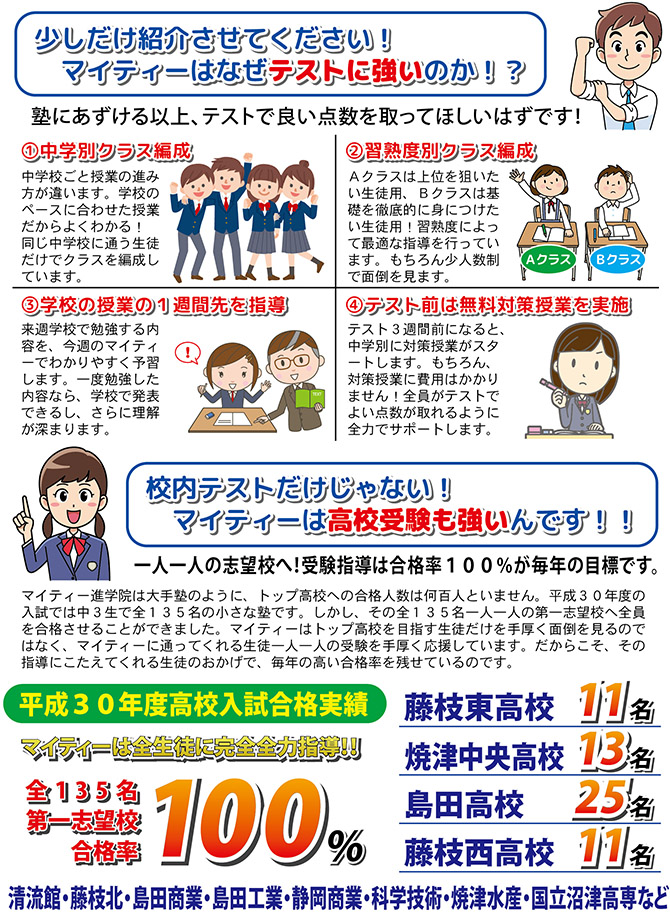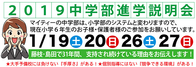 マイティー進学院の2019年度入塾説明会を下記のスケジュールで開催します。小学6年生のお子様をお持ちで中学生の塾をお考えの方や、中学生1・2生で現在塾に通っている家庭やまだ通っていない家庭の方など、マイティー進学院の学習方法をちょっと聞いてみたい方はぜひこの機会にご参加ください!