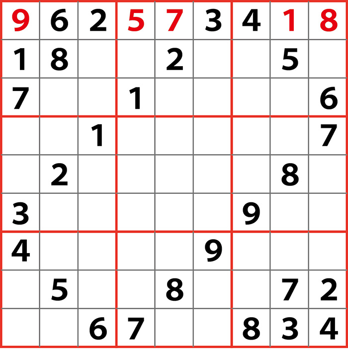 タテ列、ヨコ列、3x3のブロックにはそれぞれ1~9の数字が入ります。