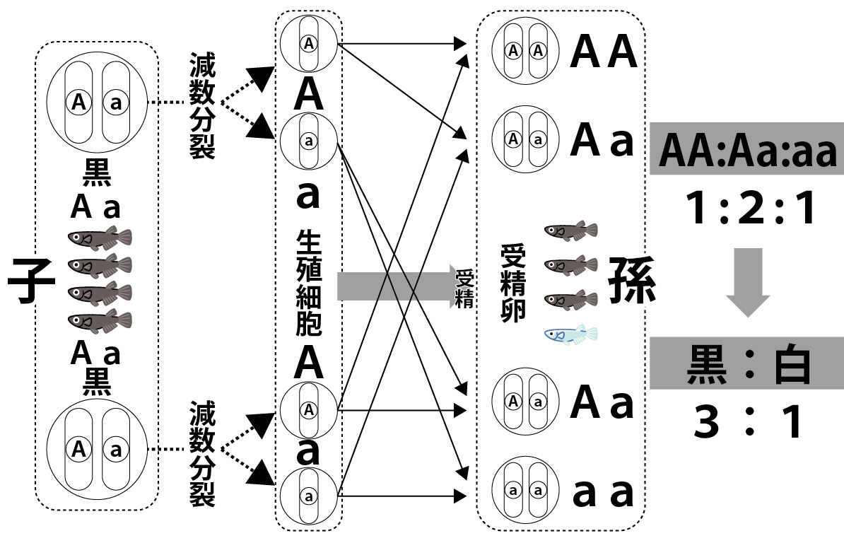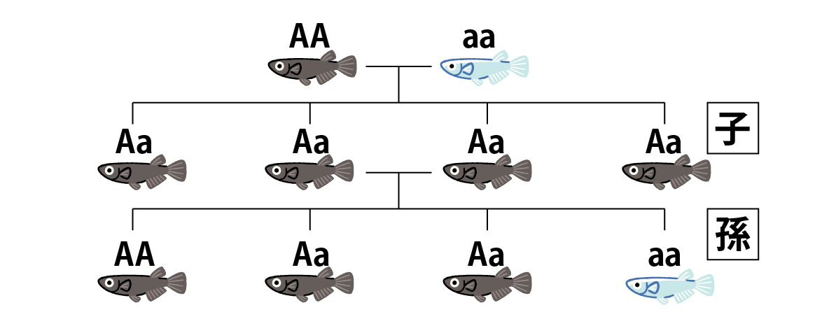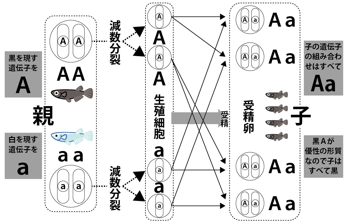 たとえば、黒(AA)白(aa)のメダカをかけ合わせます。*A…優性の形質a…劣性の形質