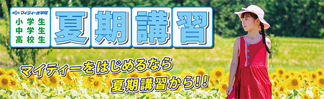 いよいよ今年も夏期講習の時期がやってきました。この夏勉強をがんばって、2学期には最高のスタートを切りたい学生達のため、マイティーだけでしか体験できない特別な夏期講習を用意しました。小学生は算数・国語の個別指導、さらに英語初心者を対象とした英語の初めてクラス。中学生は部活と両立ができる1・2年生のための夏期講習、志望校合格を目指す3年生には、ライバルに差をつける圧倒的ボリュームの夏期講習。高校生は1年生の数学と1~3年生のブロードバンド講習で、忙しい高校生を応援します。